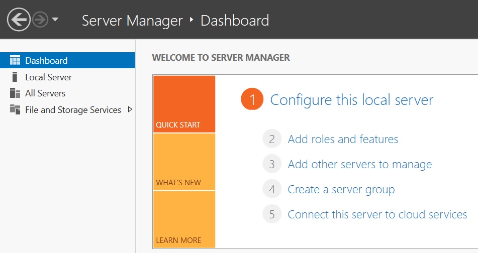 In the Server Manager Dashboard click on “Add roles and features.”