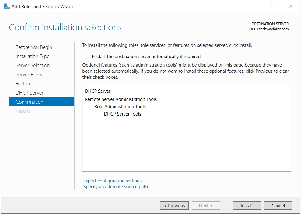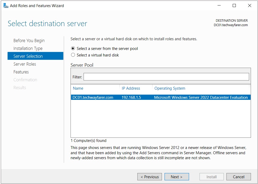 In the Server Selection tab make sure the server is chosen from the server pool. Note that the server name (DC01.techwayfarer.com) has changed to reflect that is part of the domain we created earlier. Click Next.