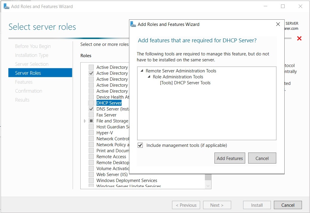 In the Server Roles tab choose “DHCP Service”, and the “Add Roles and Features Wizard” will appear. Click “Add Features” and then Next.