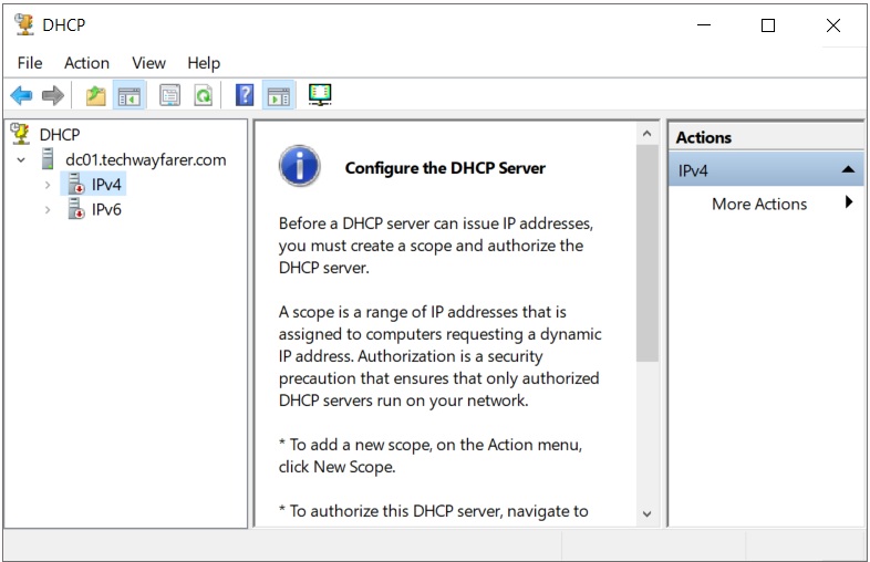 Right click on the server name (dc01.techwayfarer.com) and choose Authorize. Then right click on the name again and choose Refresh.