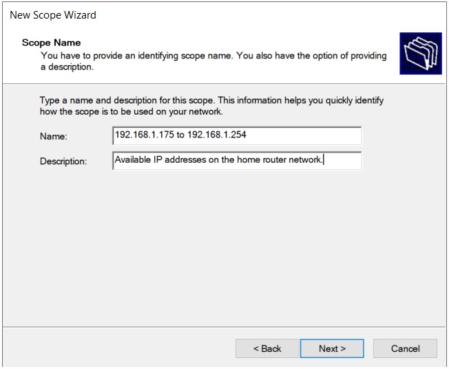 In the Scope Name window, enter a name and description for the scope and click Next. The values were determined in an earlier step of this lab.