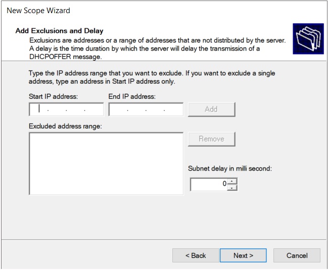In the “Add Exclusions and Delay” screen enter any IP addresses within your IP range that you don’t want assigned automatically to client devices. For instance, a printer or a server may be assigned a static IP address, and you don’t want the same IP address assigned to a client device using DHCP. For this lab, there are no static IP addresses assigned within the DHCP scope, so we will leave the fields blank and click Next.