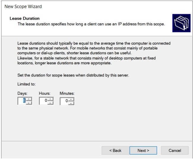 The Lease Duration window allows us to specify an expiration period for an IP address assigned to a client device.