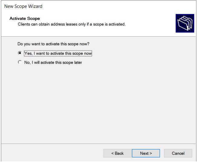 In the Activate Scope window verify that yes is chosen to activate the scope immediately and click Next.