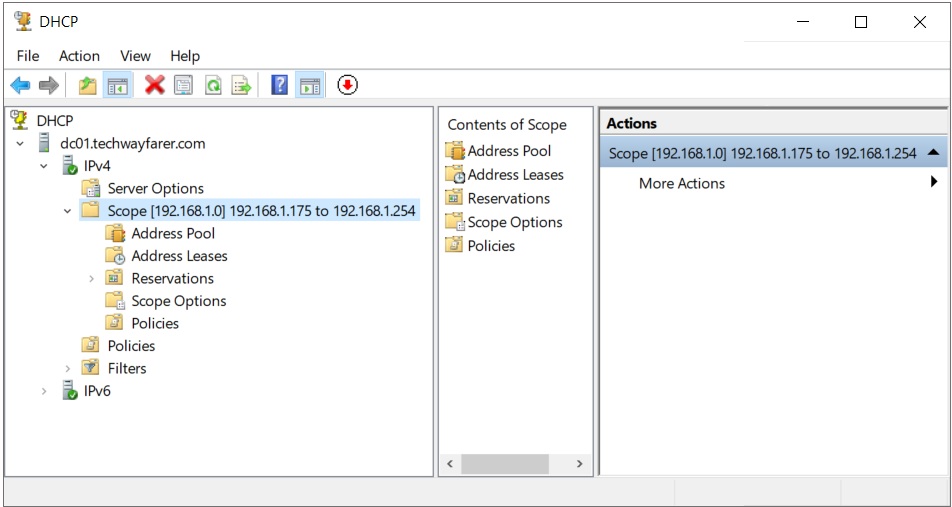 The DHCP scope is the range of IP addresses that can be assigned to client devices in the domain by the DHCP server. To set the DHCP scope open the Server Manager window, click on the Tools menu, and choose DHCP. The DHCP configuration widows will appear.